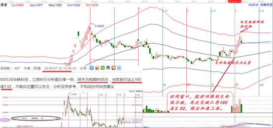 趨勢:股價處于生命線上,強勢區可操作;價格:江恩180都價格支撐點3.02,生命線支撐2.72,;時間:7月15日。具體分析及圖形可參考下圖: