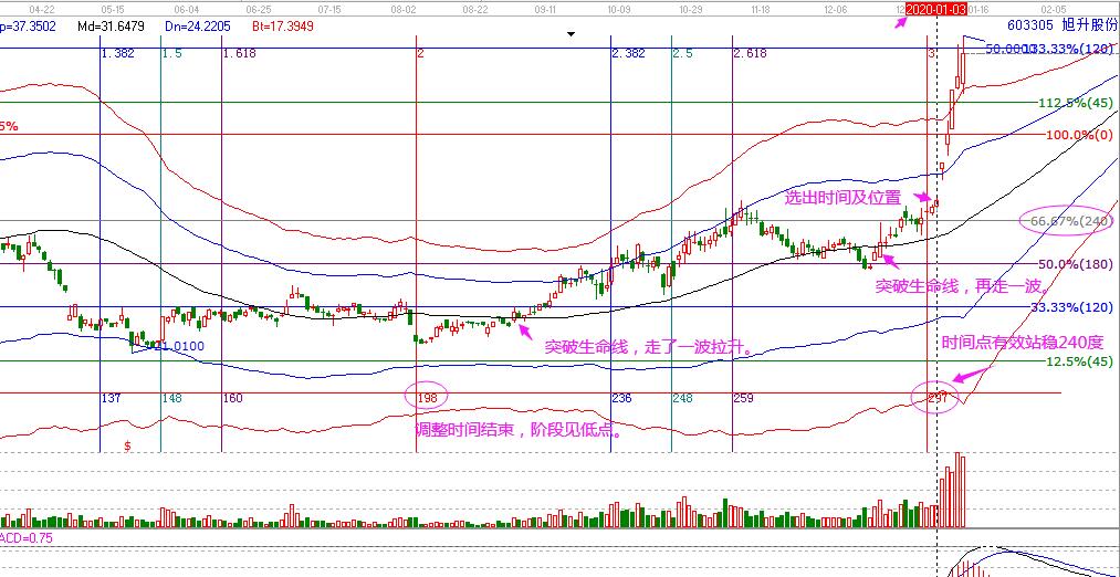 旭升股份,是在1月3日選出,理由是:股價處于生命線上的強勢可操作區域,價格在江恩240度支撐附近,江恩切線之上,時間這塊,12月31日時間窗口股價站穩240度形成突破,符合贏家時價選股模型。選出后,第二日股價便直接高開上行,封板漲停。在特斯拉題材發酵下,走出了近4板的空間。短期上漲超過40%。