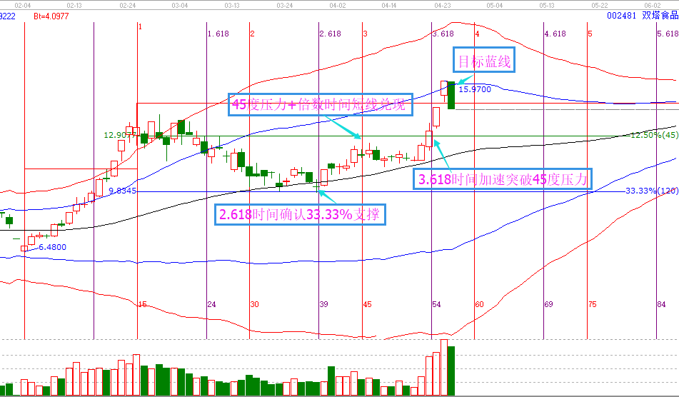 時間上:以低點6.48-高點14.76做黃金時間周期線。2.618時間遇到百分比三分位33.33%價格轉支撐勢拉升,次日漲停確認生命線,按照規則納入關注。然后在3.618時間加速突破45度,短時間快速到達預期目標位藍色上軌線。