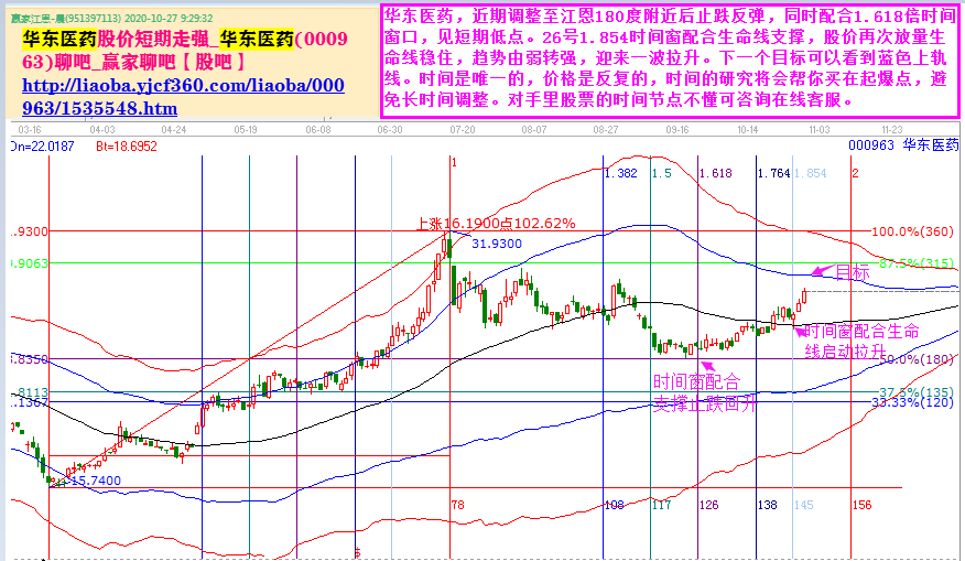 華東醫藥,近期調整至江恩180度附近后止跌反彈,同時配合1.618倍時間窗口,見短期低點。26號1.854時間窗配合生命線支撐, 股價再次放量生命線穩住,趨勢由弱轉強,迎來一波拉升。下一個目標可以看到藍色上軌線。
