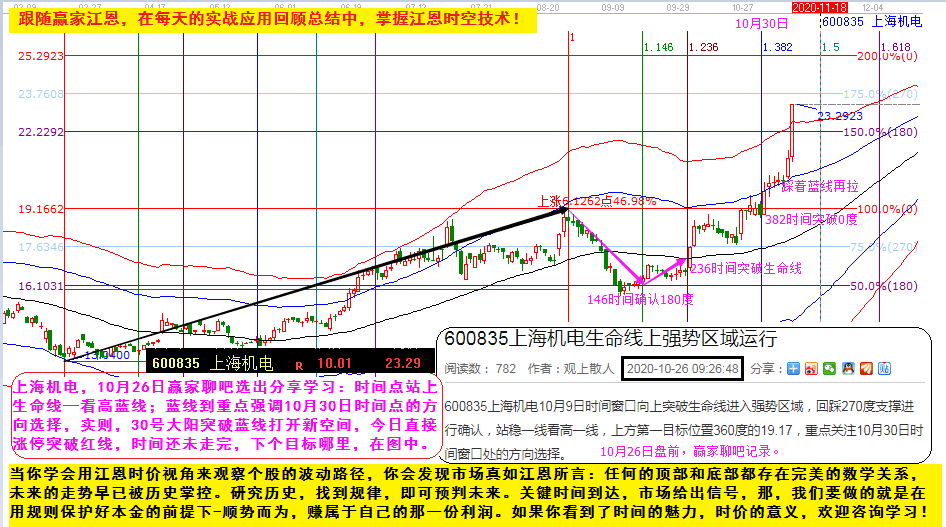 上海機(jī)電,10月26日贏家聊吧選出分享學(xué)習(xí):時(shí)間點(diǎn)站上生命線—看高藍(lán)線;藍(lán)線到重點(diǎn)強(qiáng)調(diào)10月30日時(shí)間點(diǎn)的方向選擇,實(shí)則,30號(hào)大陽突破藍(lán)線打開新空間,今日直接漲停突破紅線,時(shí)間還未走完,下個(gè)目標(biāo)哪里,在圖中。