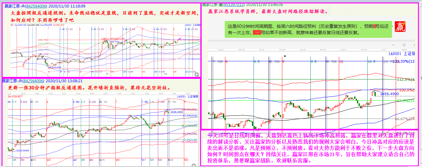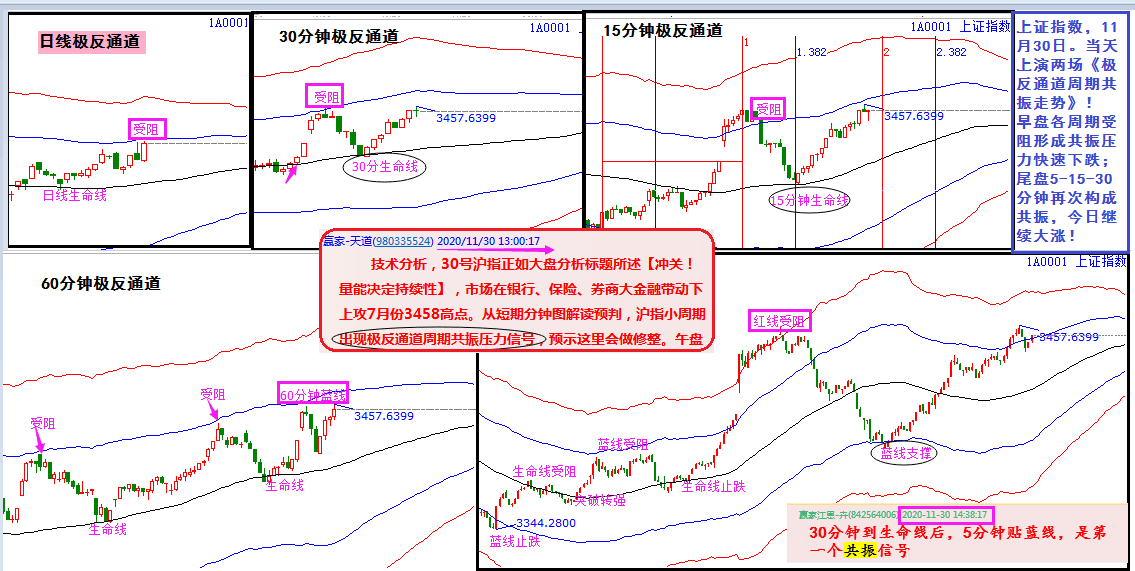 對照上證指數日線及日內各周期的極反通道匯總圖,11月30日早盤強勢上攻,各周期全部受阻形成共振賣點——快速下跌;尾盤指數5-15-30分鐘均回落到支撐線構成共振低吸信號,實則,今日大陽報收!連續兩場《極反通道周期共振信號的標準走勢》,感受到市場的神奇魅力了嗎?