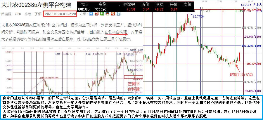 大北農在10月30日的時候就被選出正在構建左側平臺,之后進行了近一個月的橫盤,在11月25日時間窗口處的時價四方點開始啟動,并在12月3日強勢漲停。