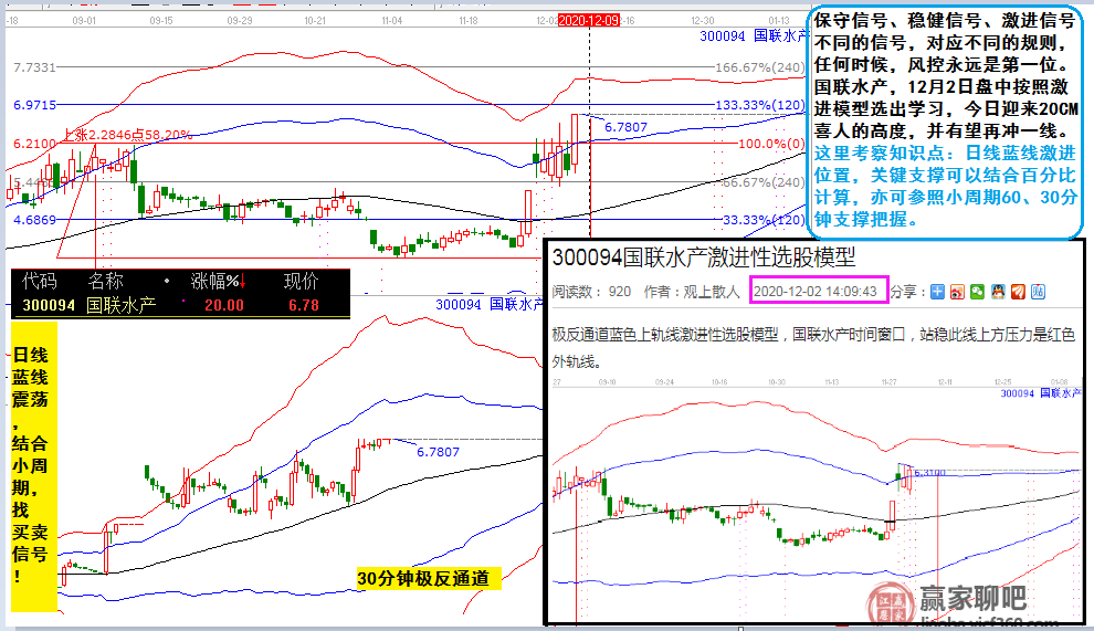 國聯水產,12月2日盤中按照激進模型選出學習,今日迎來20CM喜人的高度,并有望再沖一線。這里考察知識點:日線藍線激進位置,關鍵支撐可以結合百分比計算,亦可參照小周期60、30分鐘支撐把握。保守信號、穩健信號、激進信號。不同的交易信號,對應不同的規則,任何時候,風控永遠是第一位。
