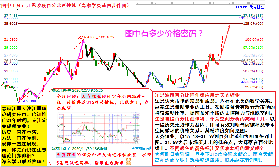 江恩認為市場的頂部和底部,均存在完美的數學關系。贏家江恩借助專業的工具,幫助投資者有效看清市場的神奇波動比率,提前預知個股的支撐阻力與漲跌空間。江恩波段百分比延伸線,作為空間分析的高端工具。以一段歷史走勢作為基因,即可有效判斷當前循環及未來空間循環的價格關系。其精準度如何見圖。天齊鋰業,以15.18-31.59劃百分比延伸線即可得到上圖。31.59之后市場所走出的低高點,大都落在百分比線上。
