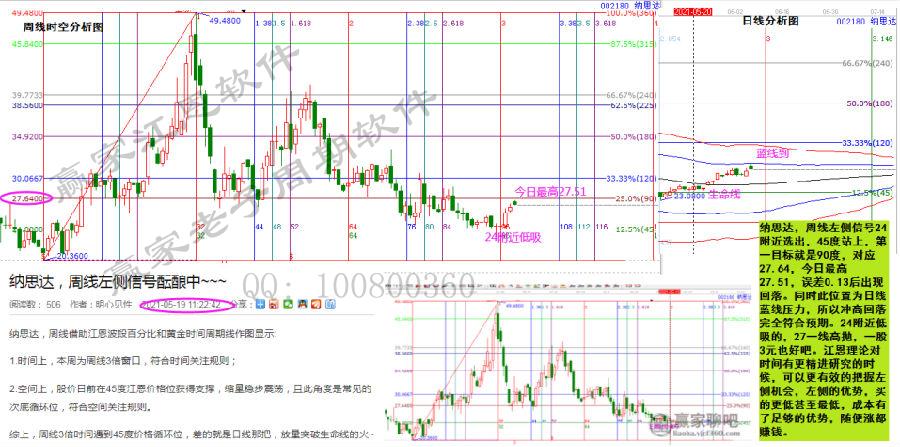 納思達,周線左側信號24附近選出,45度站上,第一目標就是90度,對應點位27.64,今日最高27.51,誤差0.13后出現回落。同時此位置為日線藍線壓力,所以沖高回落完全符合預期。24附近低吸的,27一線高拋,一股3元也不錯。江恩理論對時間有更精進研究的時候,可以更有效的把握左側機會,左側的優勢,買的更低甚至最低,成本有了足夠的優勢,隨便漲都賺錢。