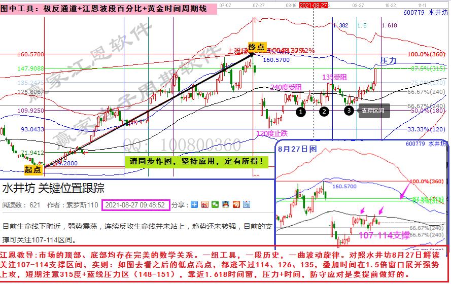 江恩教導:市場的頂部、底部均存在完美的數學關系。一組工具,一段歷史,一曲波動旋律。對照水井坊8月27日解讀關注107-114支撐區間,實則:如圖去看之后的低點高點,都逃不過114、126、135,疊加時間在1.5倍窗口展開強勢上攻,短期注意315度+藍線壓力區(148-151),靠近1.618時間窗,壓力+時間,防守應對是要提前做好的。