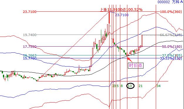 技術面解析:1.作圖如下:以2015年9月29日低點為起點,12月18日高點為終點,作出波段百分比這個工具,同時保留240度、180度、135度和120度分割位;以2015年12月18日高點的時間為起點作出費氏時間循環線;同時,調出趨勢工具極反通道。如下: