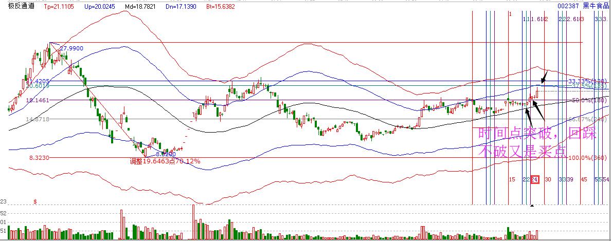 ? 上證指數(shù)經(jīng)過(guò)一波上漲,近期一直處于極反通道藍(lán)色線附近,并在此位置震蕩盤整,個(gè)股操作相對(duì)有些難度,因此,贏家建議投資者以極反通道生命線附近的股票為操作重點(diǎn),并結(jié)合價(jià)格,時(shí)間工具來(lái)精確的把握買賣。接下來(lái),筆者為大家解析近期所操作的黑牛食品,短期的高獲利讓我們?cè)僖淮尾坏貌徽J(rèn)真對(duì)待生命線附近的強(qiáng)勢(shì)股。
