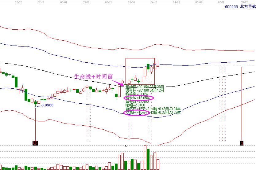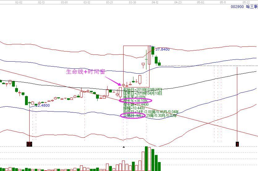 生命線和時間窗共振的位置啟動,上藍色上軌線位置,再到紅色上軌線位置,之后從紅色上軌線開始回落,走出一波完整的上漲波段。3月27日至4月10日高點,共9個交易日,漲幅空間近40%,生命線+時間窗盈利模型完美驗證。