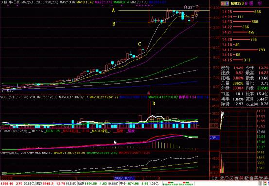 股改后復牌的個股,其價格與股改前的收盤價會有“斷裂”,由于最近大盤走高,大部分個股有補漲,于是頻頻出現“跳空缺口”。復牌當日,還會出現巨量,如(圖一)中D處。你能判斷莊家的意圖嗎?巨量是拉高出貨?還是繼續收集籌碼?除非你看“靈穩榜”,直接看清楚主動性買入量的增加情況,否則你是很難準確判斷的。