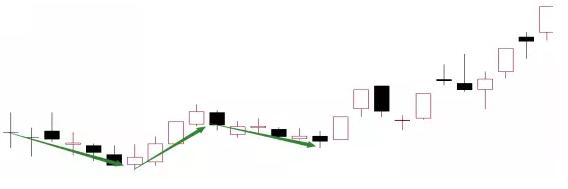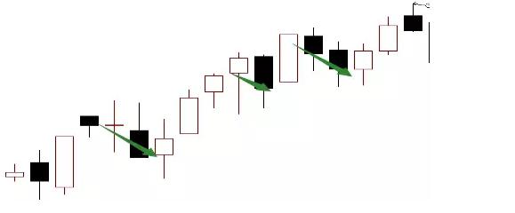 第二種途中洗盤。由于主力機構手上籌碼不足但資金非常雄厚,所以不愿意在洗盤環節上浪費時間,所以選擇邊拉升邊打壓的方式。主力每天采取盤中大幅振蕩的方式嚇出膽小投資者,陰陽相間的K線組合形態,高效洗盤的同時還能持續推高股價。