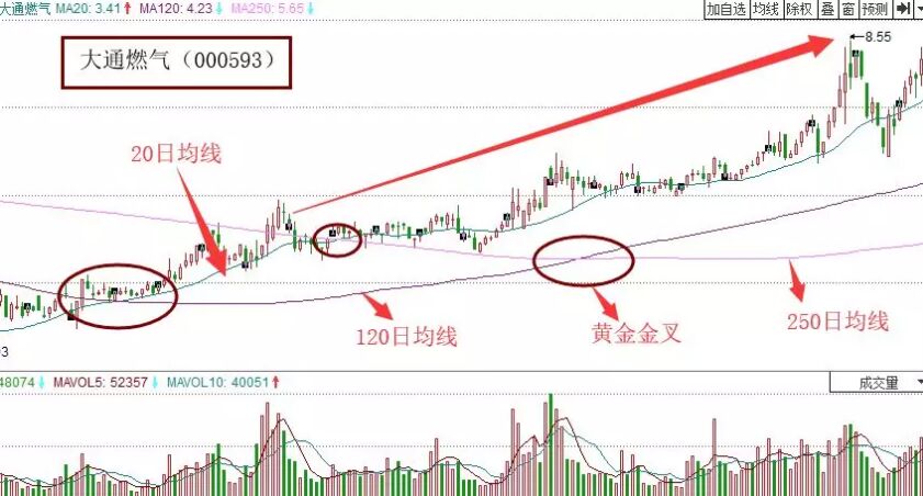 2、 順向三線開花。它指的就是在三線開花的初始點(diǎn),120日均線與250日均線是順向交叉狀態(tài),即120日均線從下向上穿越250日均線,形成兩條長期均線的黃金交叉,此時(shí)20日均線從下向上穿越這兩條均線交叉點(diǎn)的技術(shù)走勢形態(tài)。這種走勢形態(tài),在穿越的過程中成交量是有效放大,那就預(yù)示著該形態(tài)的走勢成立,當(dāng)然這個(gè)方法并不能讓我們買在啟動的最低點(diǎn),但是我們可以在交叉點(diǎn)的當(dāng)日發(fā)現(xiàn)它的趨勢,這樣就可以做到獲利,如下面的大通燃?xì)庾邉輬D。