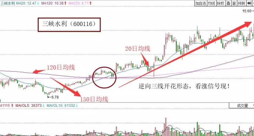 3、逆向三線開花。它指的就是在該形態(tài)的初始點(diǎn),120均線與250日均線形成死亡交叉,此時(shí)20日均線由下向上穿越這個(gè)交叉點(diǎn)的技術(shù)走勢形態(tài)。一般股票形成這個(gè)走勢的話,就預(yù)示著個(gè)股將要走牛,同時(shí)應(yīng)該有成交量有效放大的支持。如下面的三峽水利走勢圖。