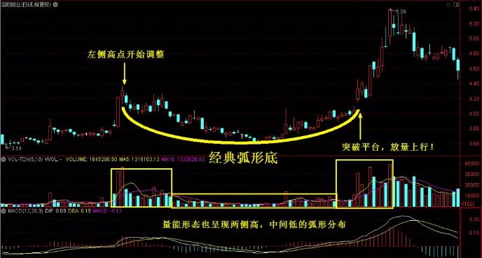 從上圖我們可以看到,這個經(jīng)典的形態(tài),可以分為圓弧的左半部分與圓弧的右半部分。左半部分是跌的過程,而右半部分是漲的過程,一般是比較流暢,一般是比較曲折。漲的過程,尤其是在面臨突破前,不可避免地會面臨著反復,只要能保持相對強勢,成交量也能出現(xiàn)明顯放大,最終一旦突破上去,漲起來的空間就會更廣闊。