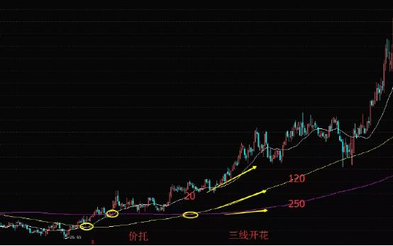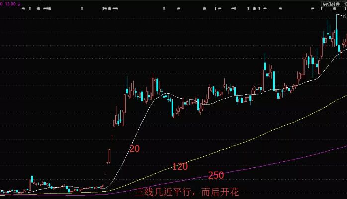 均線三線開花形態(tài)是怎么樣的?從名稱上來看的話,肯定是由三條均線所形成的,即20、120、250日均線,這三線走出金叉后,形成了多頭排列,就好像是喇叭一樣,所以這也是這個名稱的由來。當然該形態(tài)的開花的方式有很多,在前面的文章中也介紹過,接下來就簡單的舉幾個例子,幫助大家掌握該形態(tài)。