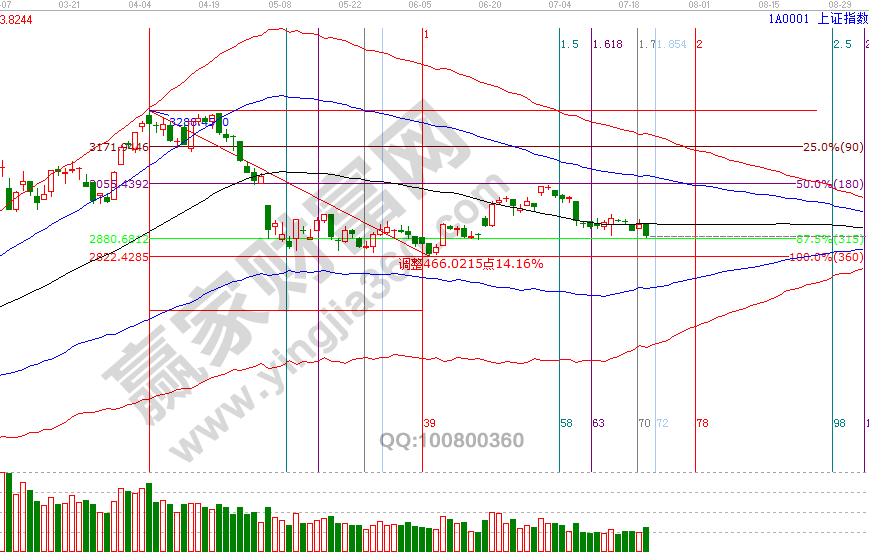 滬指昨天最低點與分析的支撐2878僅一點之差,但日線處于生命線下弱勢,深指與創(chuàng)業(yè)板明日將確認日線生命線支撐,幾大指數如都失守生命線則表示2822點的反彈結束,同時也印證了我們近十個交易日的策略,波段百分比延伸線2878、零度位2966點區(qū)間內運行持股等待,突破任何一個點位則將確認日線趨勢。20號贏家江恩系統(tǒng)培訓課中談到,失守2878點向下則看周線生命線(贏家學員參考極反通道查看具體位置)及缺口位置,突破2966點則再一次確認3048高點。預判目的是做應對計劃,是敬畏市場的一種體現(xiàn),漲跌市場有自身運行規(guī)律,投資者做好持倉跟隨,是對交易、本金的負責。23、24號時間窗口后,下個一日線級別時間是8月1號。7月23號盤中壓力是135度2911點、180度2928點,盤中支撐是0度2860點、315度2844點【參考性強】。操作策略,指數極反通道生命線下弱勢震蕩,整體持倉保持3成以內,降低操作頻次。