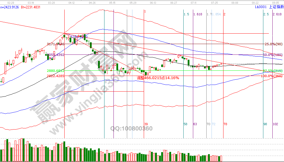 從江恩時間周期角度分析,市場又到了一個日線方向選擇區(qū),回顧近幾個月指數(shù)時間窗口(3月7號、4月8號、5月17號、6月5號、27號、7月3、15、23號),市場的重要級別、次要級別的時間拐點都是提前做出測算并公布,今天收盤后贏家江恩技術團隊將借助工具分享8月時間窗口,目前公布的第一個是1號(黃金時間周期0.618);價格方面,江恩價格百分比延伸線2倍零度位2966點與240度2878點,是自8號后強調的具有操作條件的兩個位置,15、23號分別觸及2878點后回升,昨天是上攻至2966點(最高2965相差一個點)回落,結合趨勢,時間、價格三者綜合判斷,本周后半周持有倉的投資者要關注好盤面動向,并做好應對計劃策略,7月31號盤中壓力是270度2961點、315度2978點,盤中支撐是180度2928點、225度2944點。操作策略,指數(shù)極反通道生命線震蕩,指數(shù)失守60分鐘生命線則反彈信號結束,向上則關注60分鐘藍色上軌線也有望形成反彈結束信號,投資者保持3成。