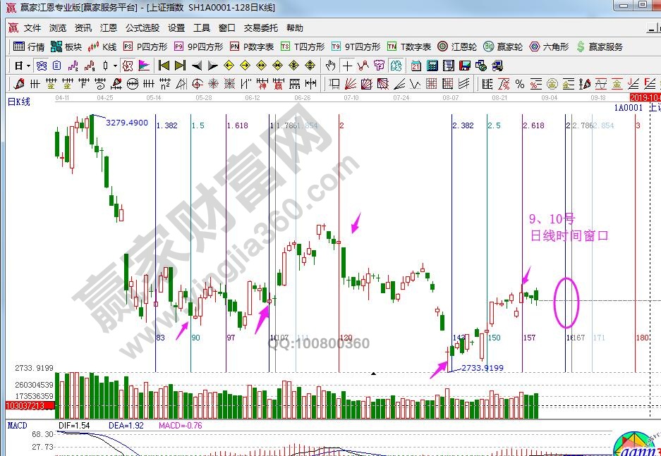☆依據贏家江恩理論系統江恩黃金時間周期線提示:以2019年1月4號(2440點)為起點,2019年4月8號(3288點)為終點做圖,9(10)號、16號、27號時間窗口。