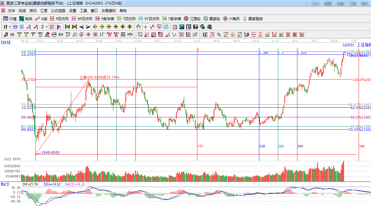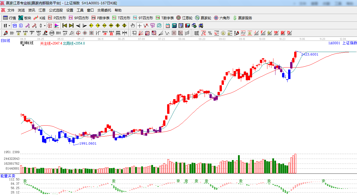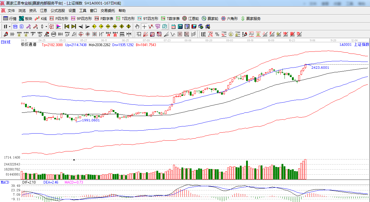 ★依據(jù)贏家江恩系統(tǒng)極反通道提示:指數(shù)繼續(xù)放量上行,突破藍色外軌2410點,留意后期量能,如不能支持,此位置將仍有反復。