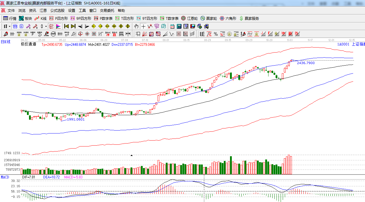 ★依據贏家江恩系統極反通道提示:藍色外軌線支撐是2410點附近,留意后期量能,如不能支持,此位置將仍有反復。