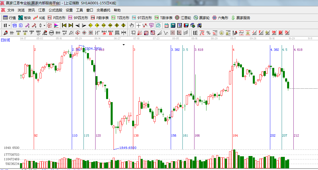 ☆依據贏家江恩系統乾坤K線提示: 紫色多空轉換位置轉為藍色做空休息區;