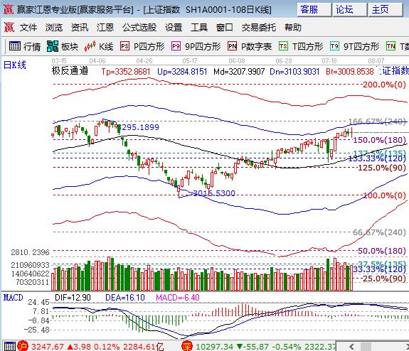 大盤周三高開震蕩收長上下影的小陽線,權重繼續極力維護著指數走勢,深市幾大指數均下跌。板塊方面,券商、銀行漲幅居前,家電、釀酒、汽車等二線藍籌領跌,保險則是砸盤主力;題材方面,租購同權、化工和有色資源等漲價概念、鋰電和近期開板新股等比較強勢,而蘋果、超跌次新走勢較弱。個股跌多漲少成交量較前日有所放大。技術方面,滬指日線盤中震幅擴大,但依然維持在江恩百分比180度3222點與極反通道外軌線3270點區間震蕩,尾盤拉升短周期15分鐘收盤勉強站上生命線,30、60分鐘處于生命線上附近運行,白馬的輪番砸盤,個股沖高回落概率增加,操作上保持謹慎,倉位保持在5成,3222、3208為日內支撐,3256、3269為日內阻力,僅供參考,不構成任何投資建議。