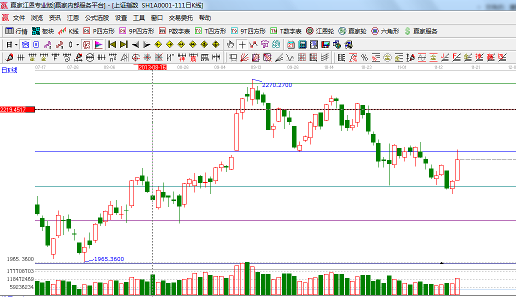 ★依據(jù)贏家江恩系統(tǒng)波段百分比延伸提示:黃金分割價格圖0.382位置是2149點(diǎn),0.5位置是2090;