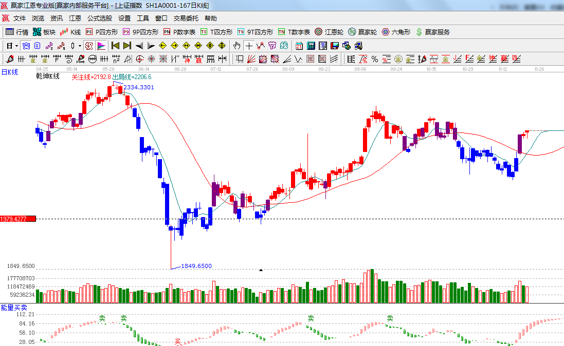 ★依據(jù)贏家江恩系統(tǒng)能量買賣提示:紅色柱子出現(xiàn),多方占據(jù)主動權看多;