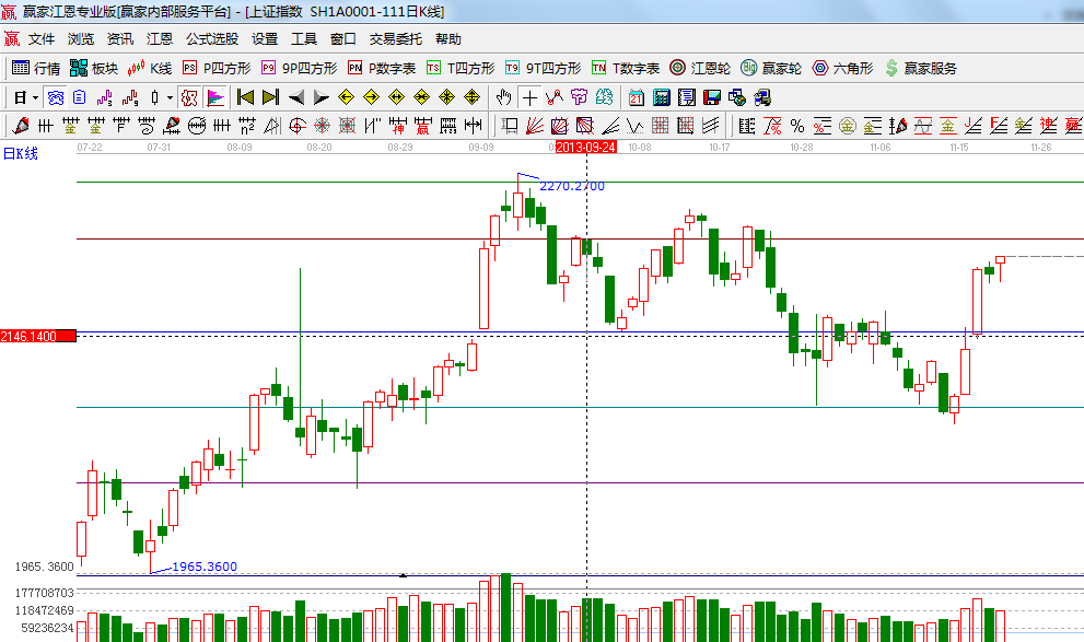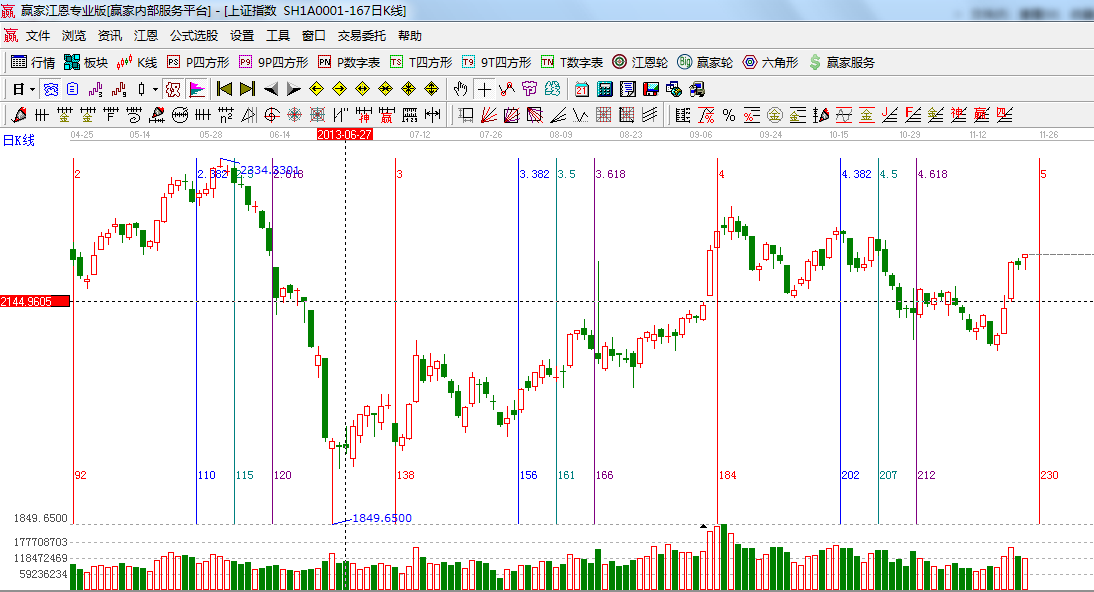☆依據(jù)贏家江恩系統(tǒng)波段百分比延伸提示:黃金分割價格圖0.236位置是2219點,0.382位置是2050點;