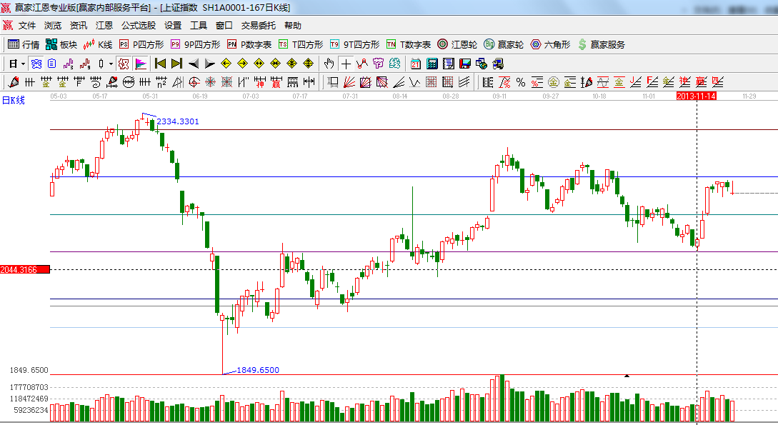 ☆依據(jù)贏家江恩系統(tǒng)波段百分比延伸提示:2444與1849點(diǎn)做黃金分割價(jià)格圖,0.382位置是2217點(diǎn),0.5位置是2150點(diǎn);