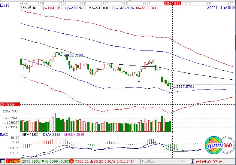 受歐美股市大漲提振,三大股指早盤全線高開,隨后一路震蕩走低,滬指盤中再創新低,午后在芯片、軟件等科技板塊帶動下,股指探底回升,兩市仍有30只個股跌停,康美藥業、中國國旅、京新藥業等一批高位強勢股全線大跌。從盤面上看,國產軟件、網絡安全、芯片、知識產權保護、區塊鏈等板塊領漲;油改、頁巖氣、草甘膦、天然氣、自由貿易港等板塊領跌。滬指上漲0.6%,報收2561點;深成指上漲0.91%,報收7365點;創業板上漲1.25%,報收1231點。相應的極反通道指標的支撐壓力提示,如下圖所示: