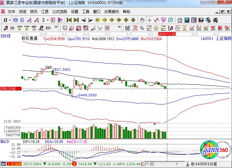 滬指跌1.05%,報收2549點;深成指跌1.48%,報收7418點;創業板跌1.90%,報收1268點。盤面上看,豬肉、石油、醫療器械、自由貿易港、醫藥電商等板塊跌幅居前。滬股通凈流出6900萬,深股通凈流出4億。相應的極反通道指標的支撐壓力提示,如下圖所示: