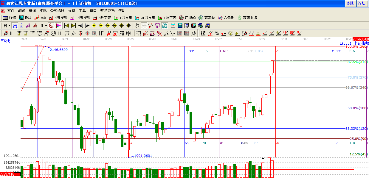 江恩看盤綜述:依據贏家江恩技術工具分析得出:在權重的帶動下,指數繼續強勢上攻,突破極反通道藍色外軌線,短期面臨前期頭部2146點阻力,周一留意沖高回落動作,7月28日又是前期提到時間窗口。謹慎留意盤面變化。